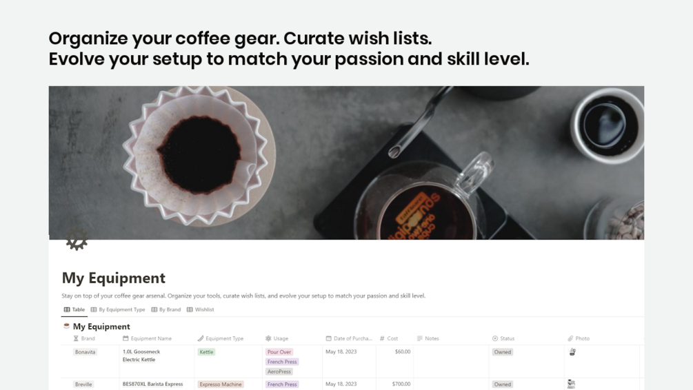 ⚙️ Equipment: Stay on top of your coffee gear arsenal. Organize your tools, curate wish lists, and evolve your setup to match your passion and skill level.